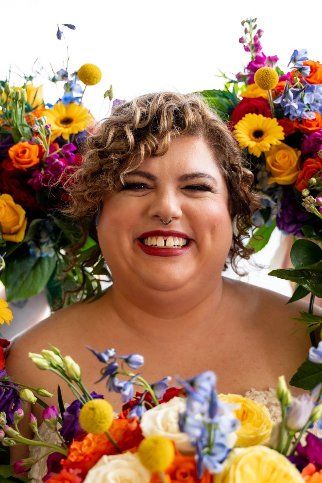 On her wedding day surrounded by flowers!