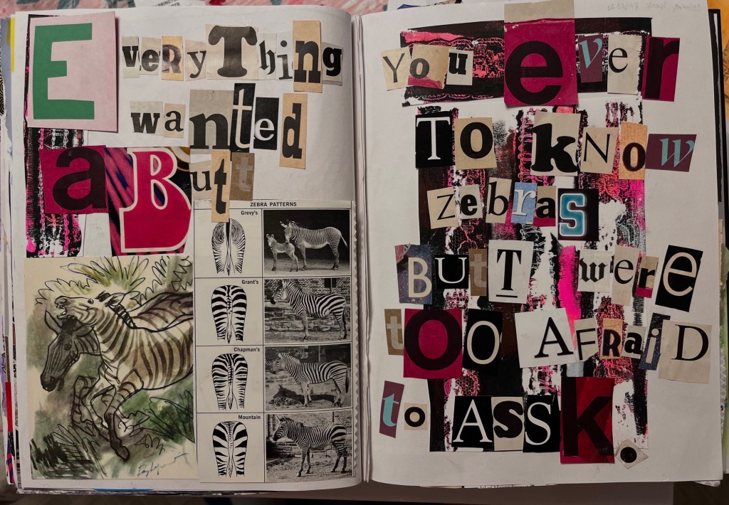 Peek inside the pages of my art journals! “Yin & Yang” “Childlike Wonder” “Orange” Untitled “She’s not a delicate little flower” “Everything you ever wanted to know abutt zebras butt were too afraid to assk.” “Animals as my moods” “History of Destruction” “Witches don’t age” “Cherry Bomb” “The Dance on the Beach” Stay tuned as I Frankenstein more books together… Share this: Click to share on X (Opens in new window) X Click to share on Facebook (Opens in new window) Facebook Like Loading... Share this: Click to share on X (Opens in new window) X Click to share on Facebook (Opens in new window) Facebook Like Loading...
